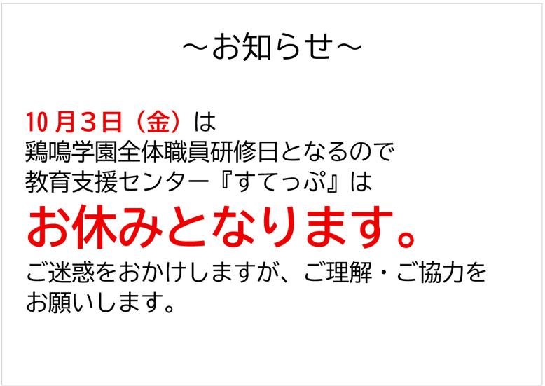 ※8月9日(土)~8月17日(日)まではすてっぷ教室、休室となります。